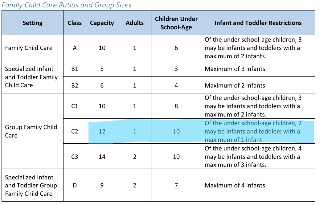 Our C2 License allows for us to have one infant and toddler OR two toddlers maximum, as well as 8 of preschool age and 2 school age kids. We are working to gain a C3 license some time in the Spring of 2026.